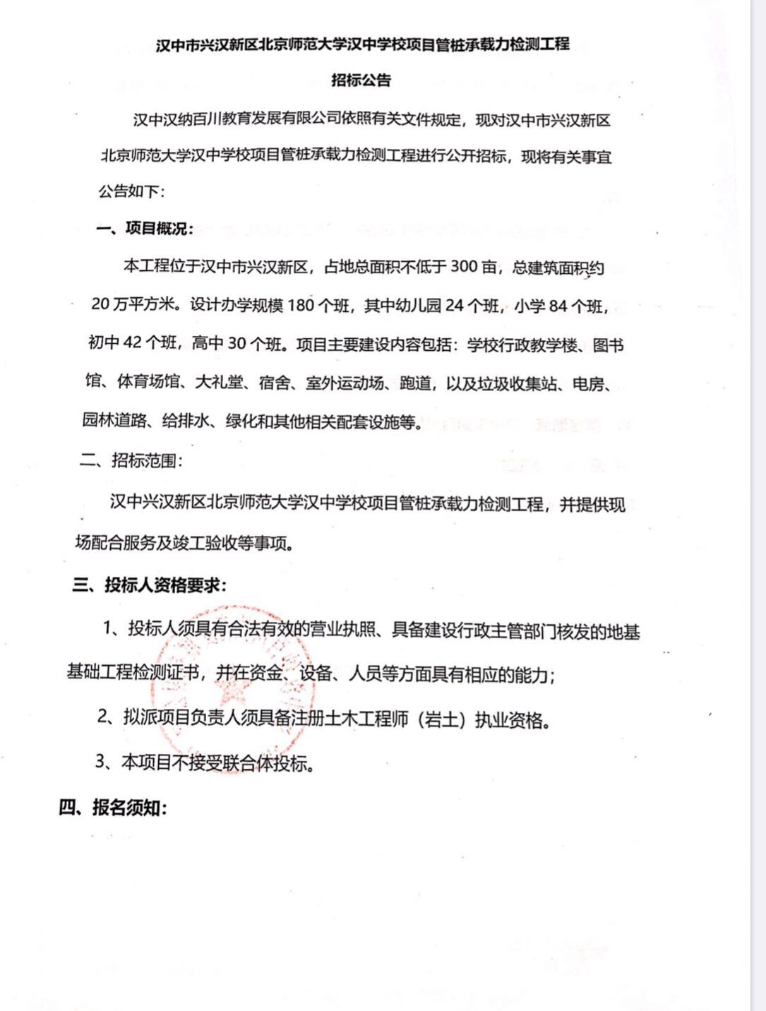 漢中市興漢新區北京師范大學漢中學校項目管樁承載力檢測工程招標公告 漢中漢納百川教育發展有限公司...